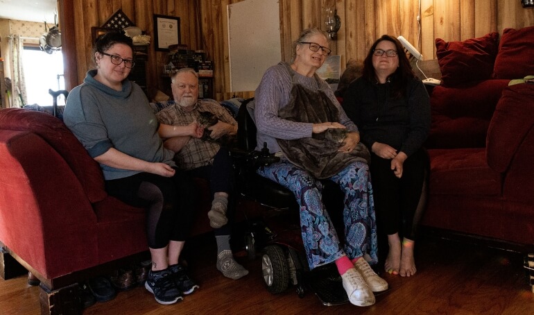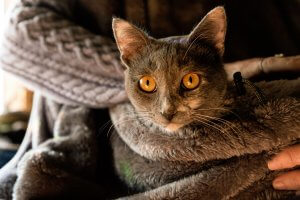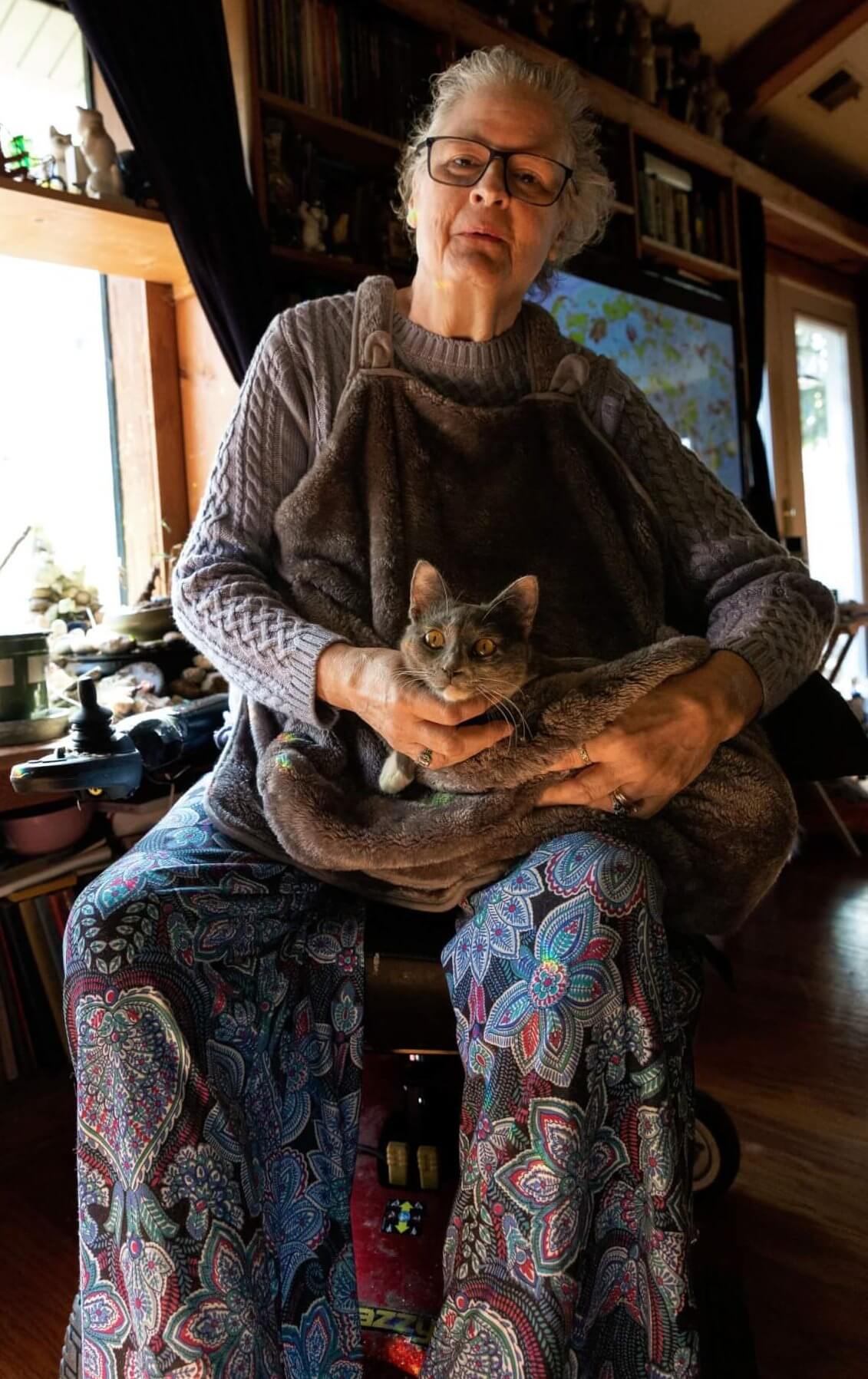 She loves to cuddle up to me in bed. Her happy purrs make my heart glow! I have a kitty pouch that she loves to lie in while we ride around in my power chair. Alanna likes to hang out with me in the kitchen. She and Elvira act as “quality control”, taste-testing what they are allowed.