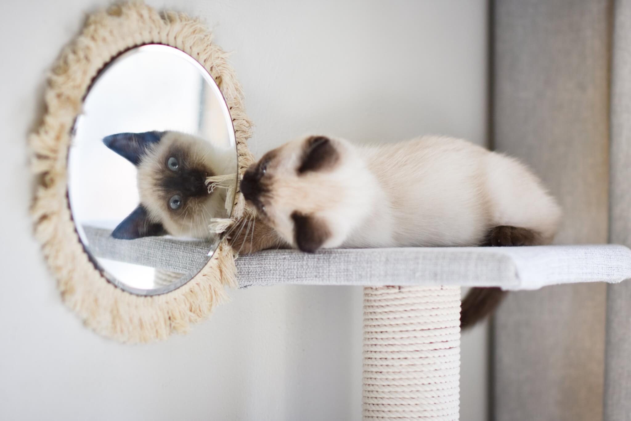 We play with her with toys or on her cat tree. She likes looking in mirrors. We also got her a harness to take her on walks, though she’s not quite used to that yet. The first couple of times we put on the harness, she just flopped right over. We are taking it slowly introducing her outside. She is excited to see everything but gets overwhelmed.