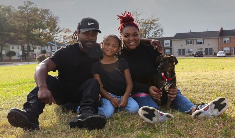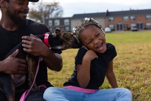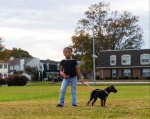 We decided we wanted to add a dog to the family so we went to the VBSPCA. Derrick [Jazmine’s partner] saw her first and instantly wanted to spend time with her. When we took her in the room, she instantly came to me and got in my lap. My heart melted and I remembered my family saying, your dog picks you, you don’t pick the dog. She jumped all over Cynia [Jazmine’s daughter] and Derrick too. I knew she was meant for us, but unfortunately there was a family who had applied to adopt her first. I was so nervous because we had fallen in love with her and there was a possibility we wouldn’t get to bring her home. Fate was on our side because the other family’s application fell through.