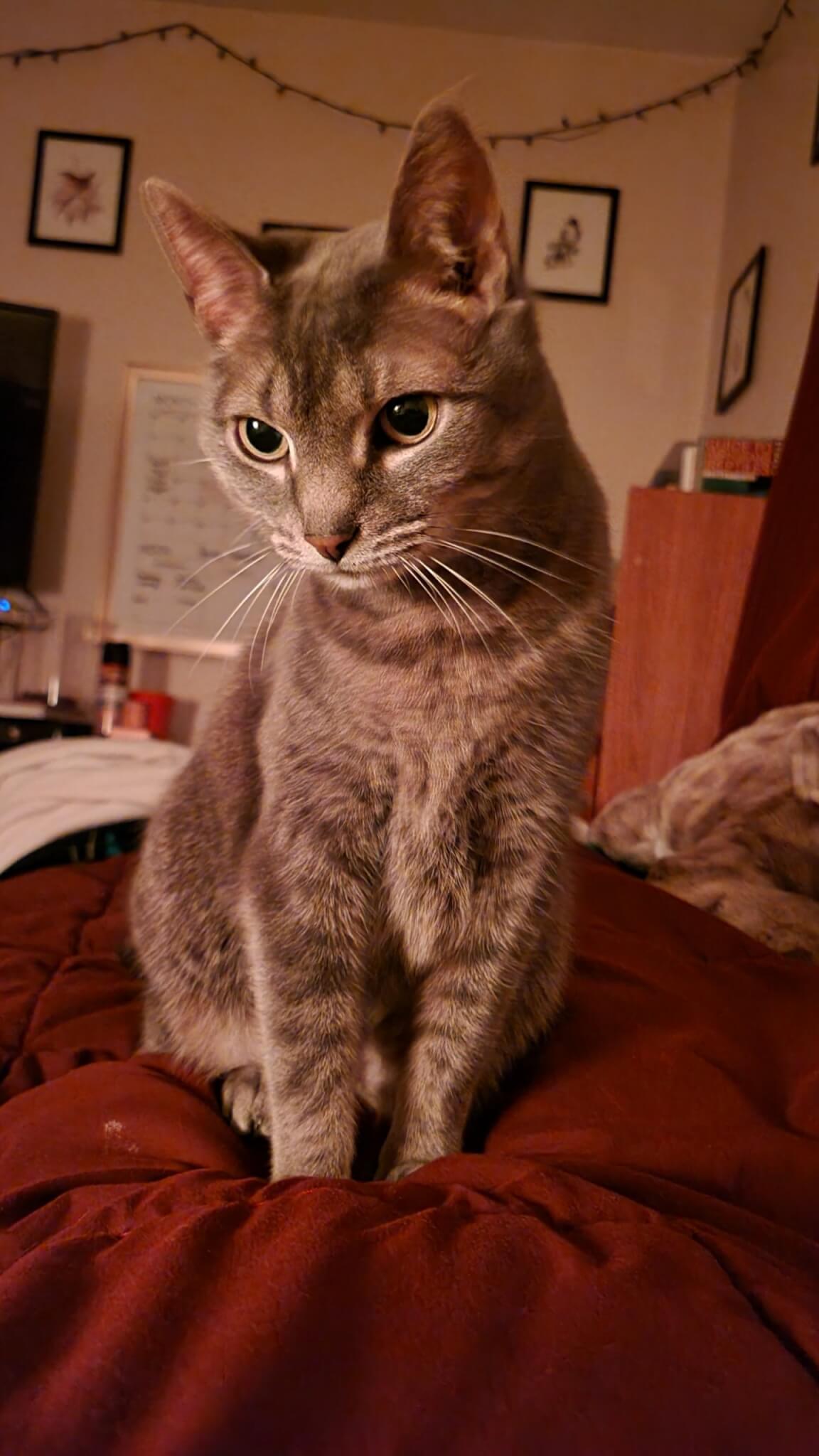 She doesn’t really meow much, but as she has gotten more comfortable, she chirps at us all the time. She is very silly and obsessed with rugs, rolling around [on them] while purring or using them as a scratcher.