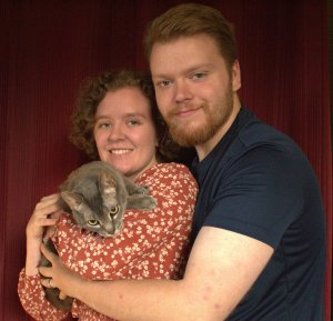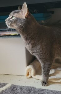 She doesn’t really meow much, but as she has gotten more comfortable, she chirps at us all the time. She is very silly and obsessed with rugs, rolling around [on them] while purring or using them as a scratcher.