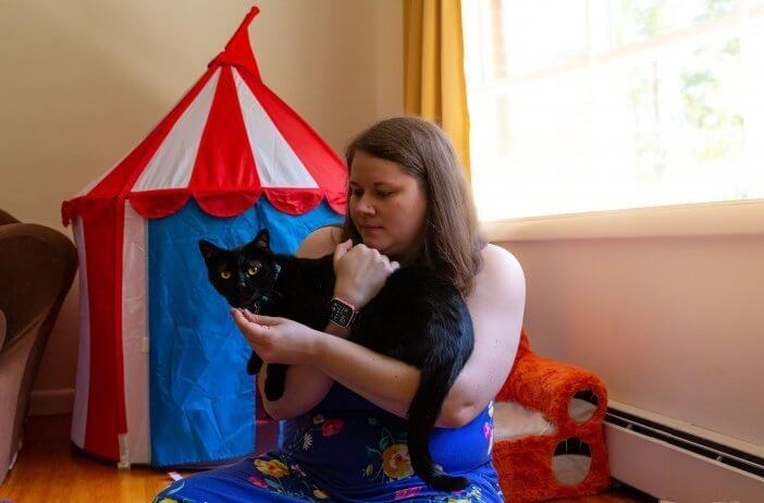We love to cuddle on the couch. He loves to sit on my chest and get chin scratches from my husband and I. My son loves pet Shadow and says, “Ahh Shadow! He’s a good cat.”