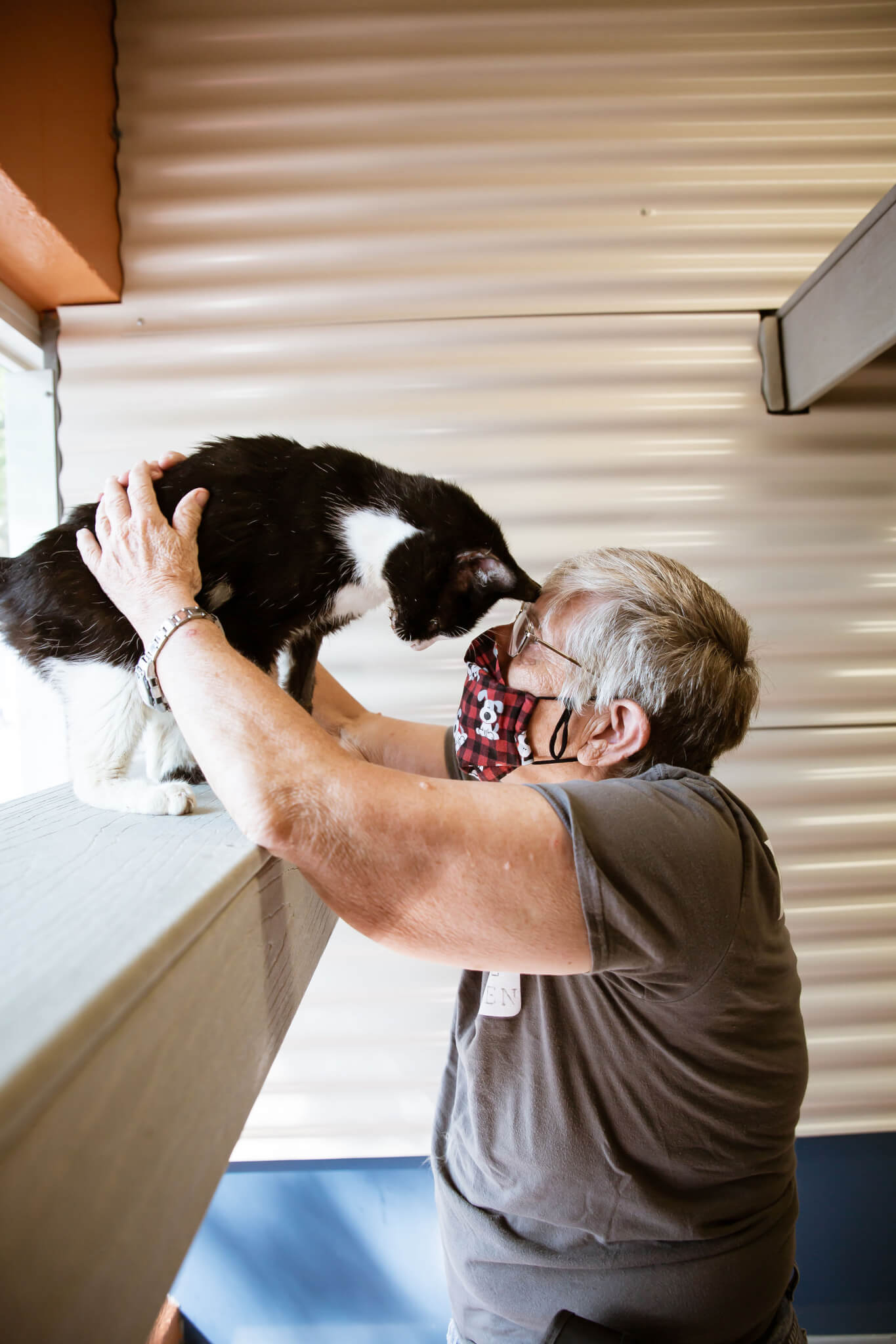 While she is an integral part of daily life at the shelter, Larsen claims that she almost didn’t show up to her volunteer orientation. Her introverted personality made her nervous to take the first step, but once she got started, all of her worry about volunteering went away. “I work in the cattery and I love it because it gives me a little time to myself in the mornings before the rush starts. There’s a calming feeling of working around animals early in the morning, and I am so happy to have had this opportunity,” she said.